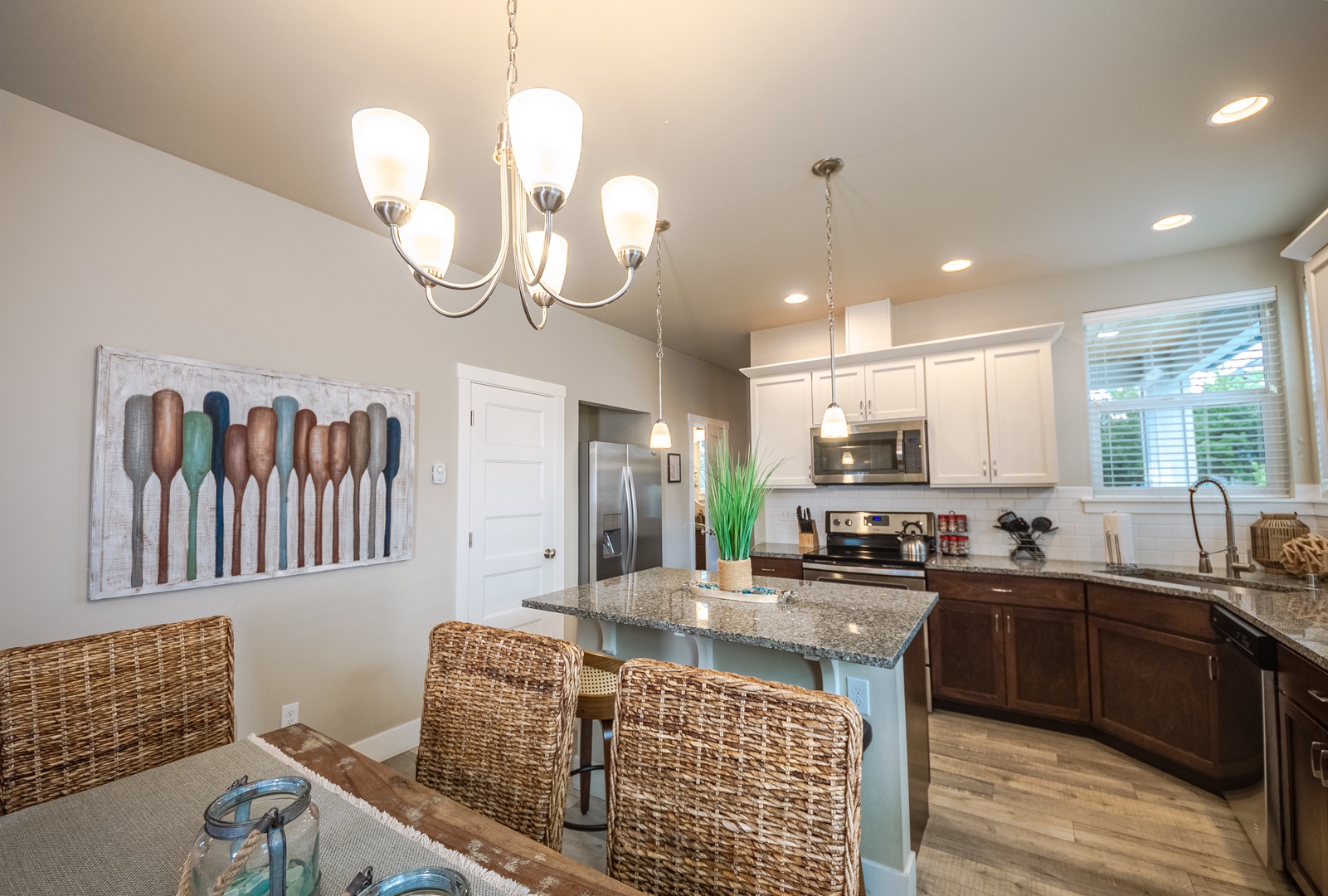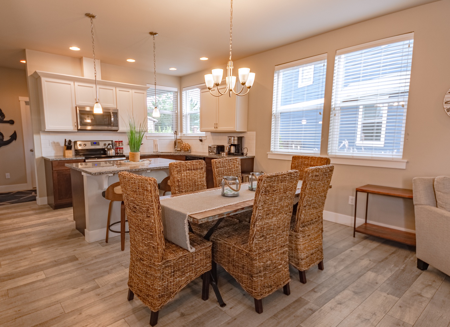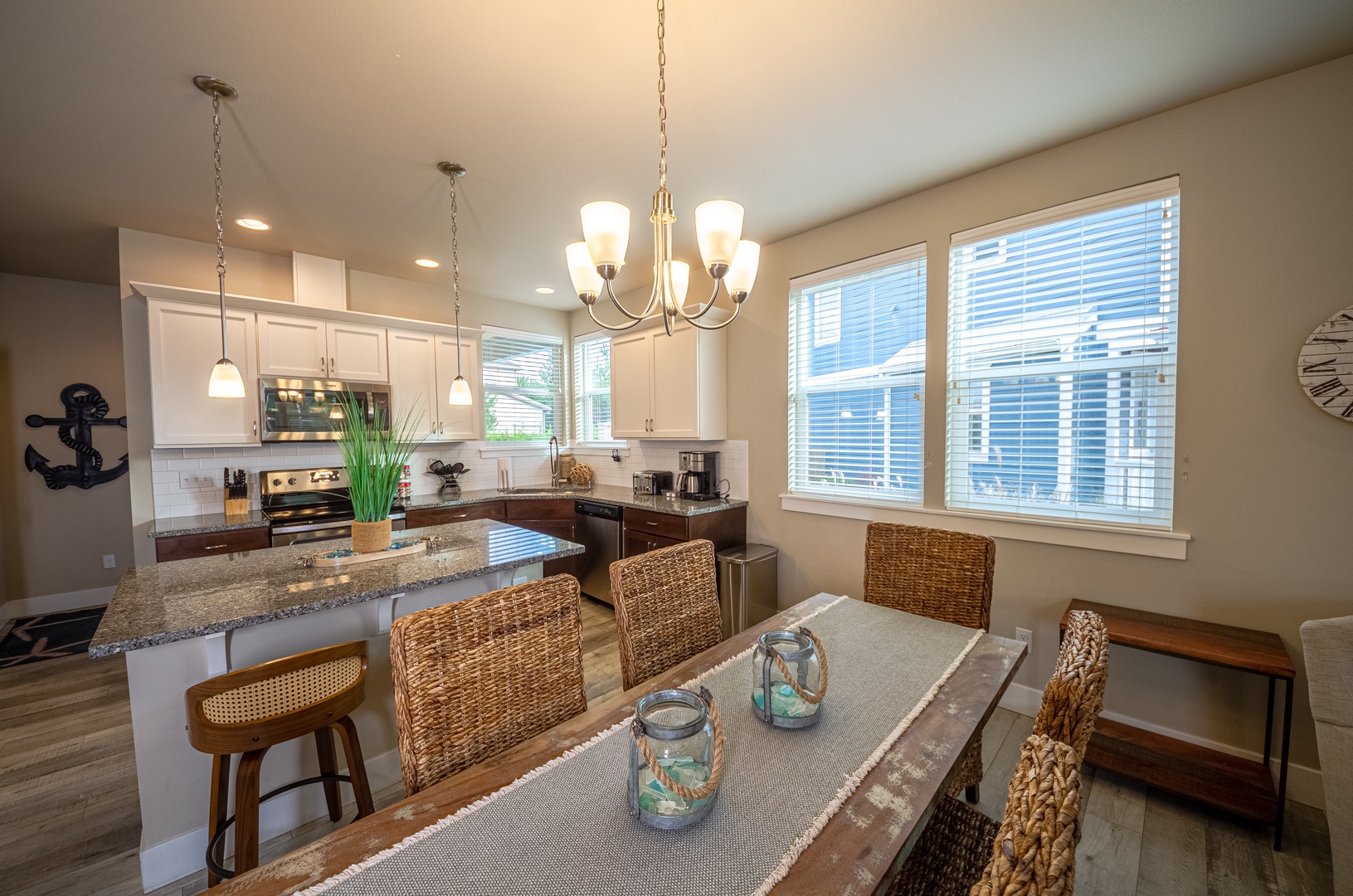 Inside, the well-equipped kitchen makes cooking effortless, complete with a full spice rack, quality cookware, and all the essentials. A dedicated bar near the entryway provides a great spot to mix drinks or set out refreshments after a day of fun.