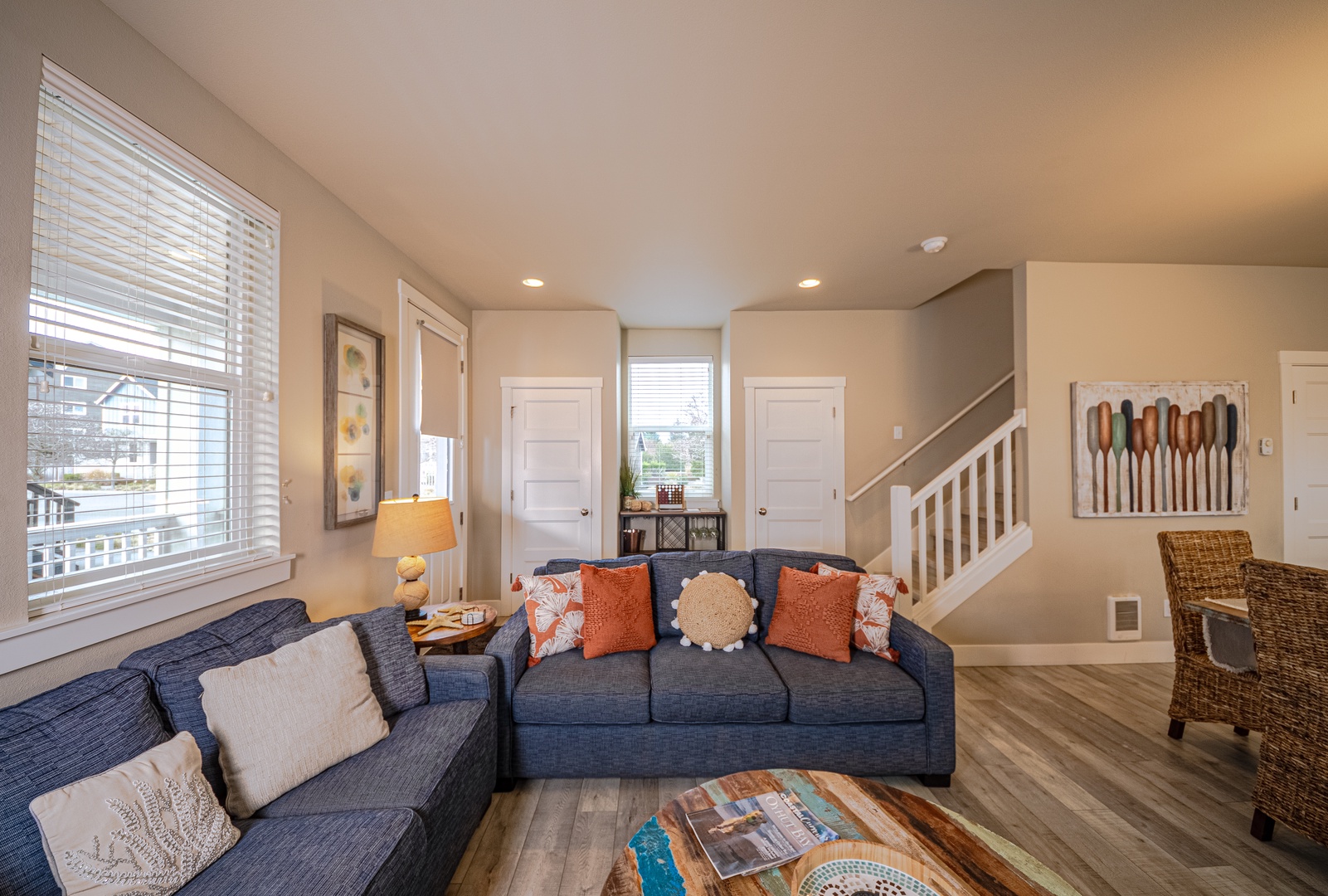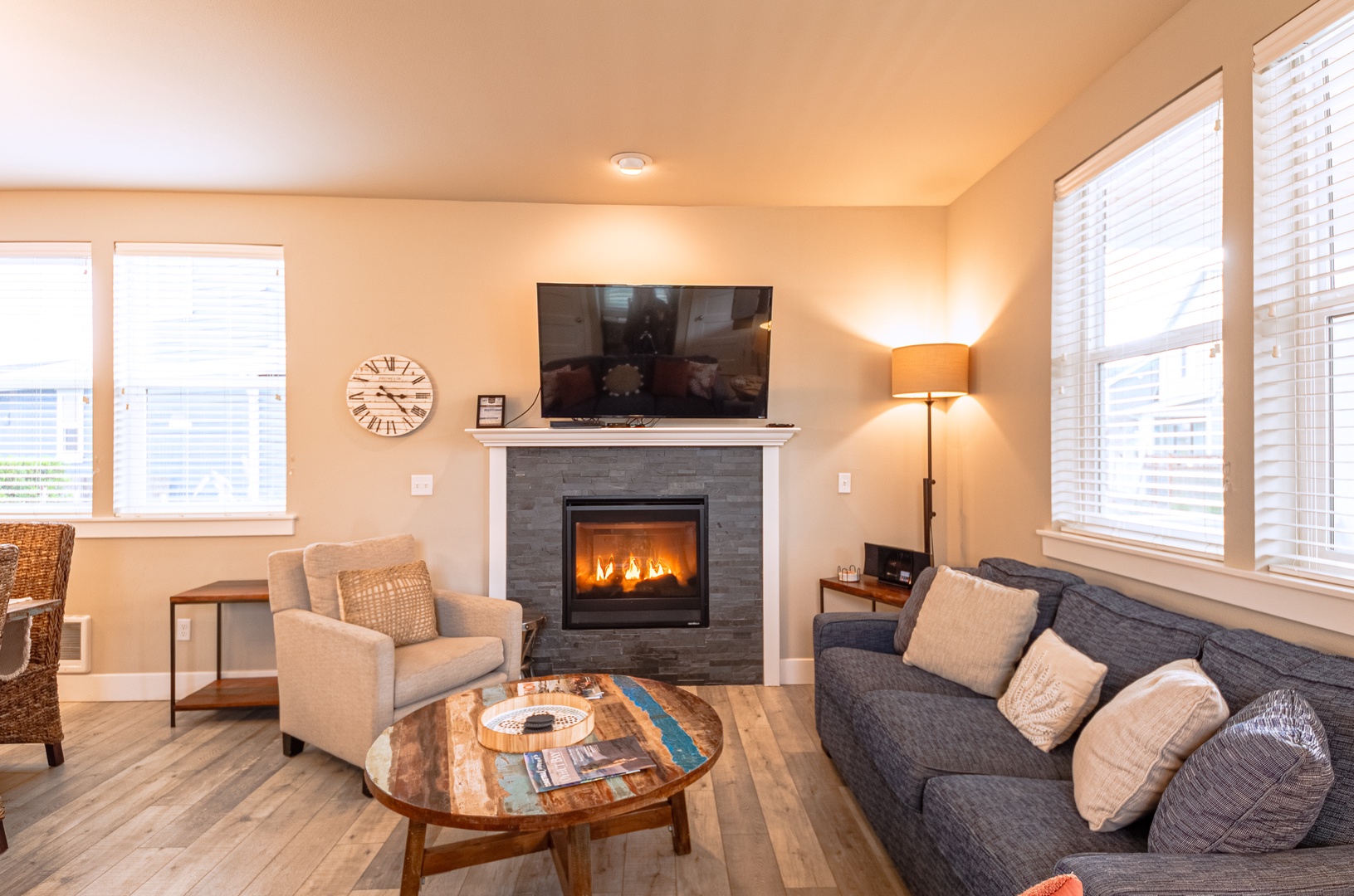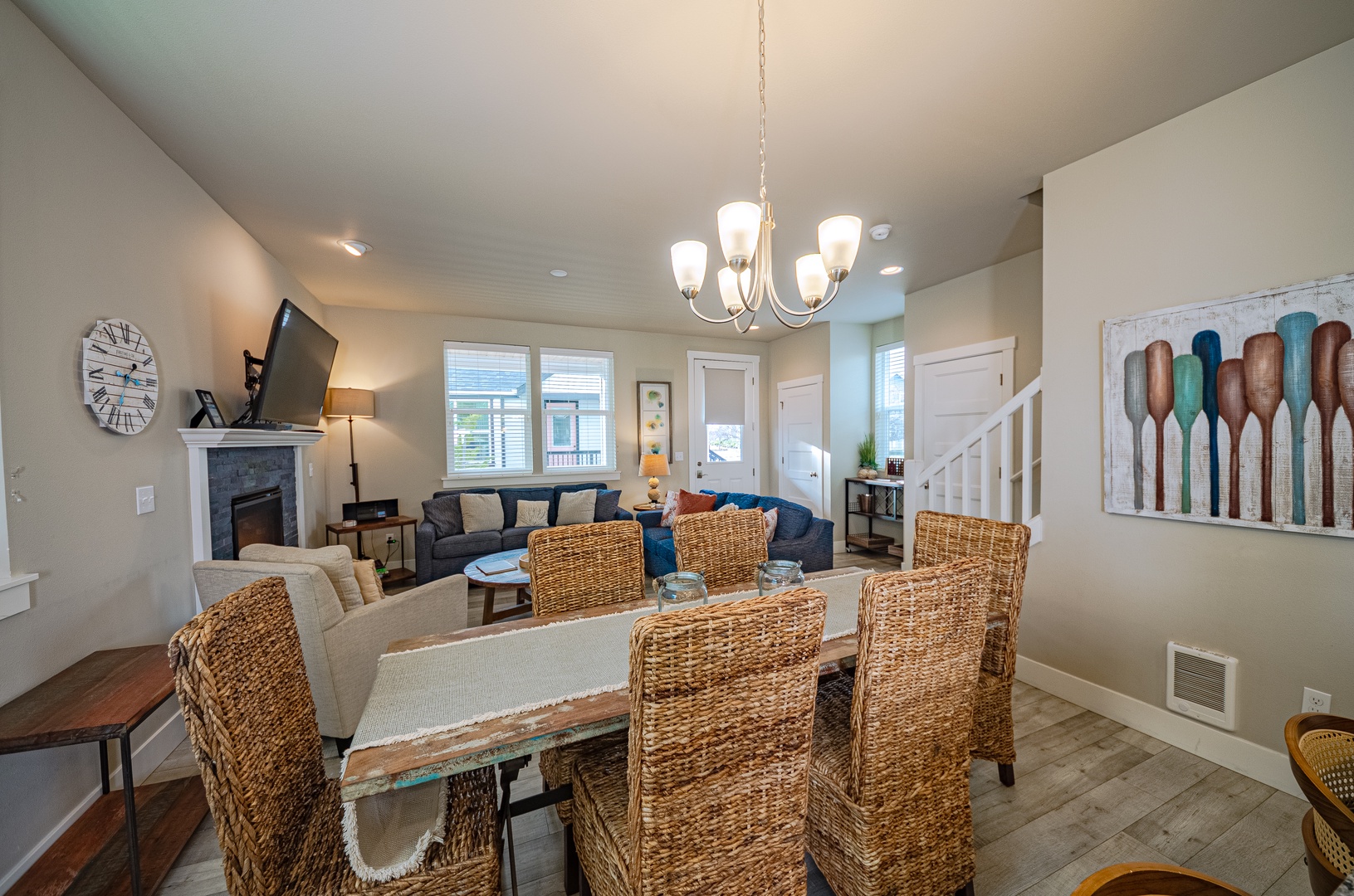 Inside, the well-equipped kitchen makes cooking effortless, complete with a full spice rack, quality cookware, and all the essentials. A dedicated bar near the entryway provides a great spot to mix drinks or set out refreshments after a day of fun.