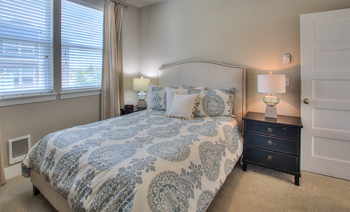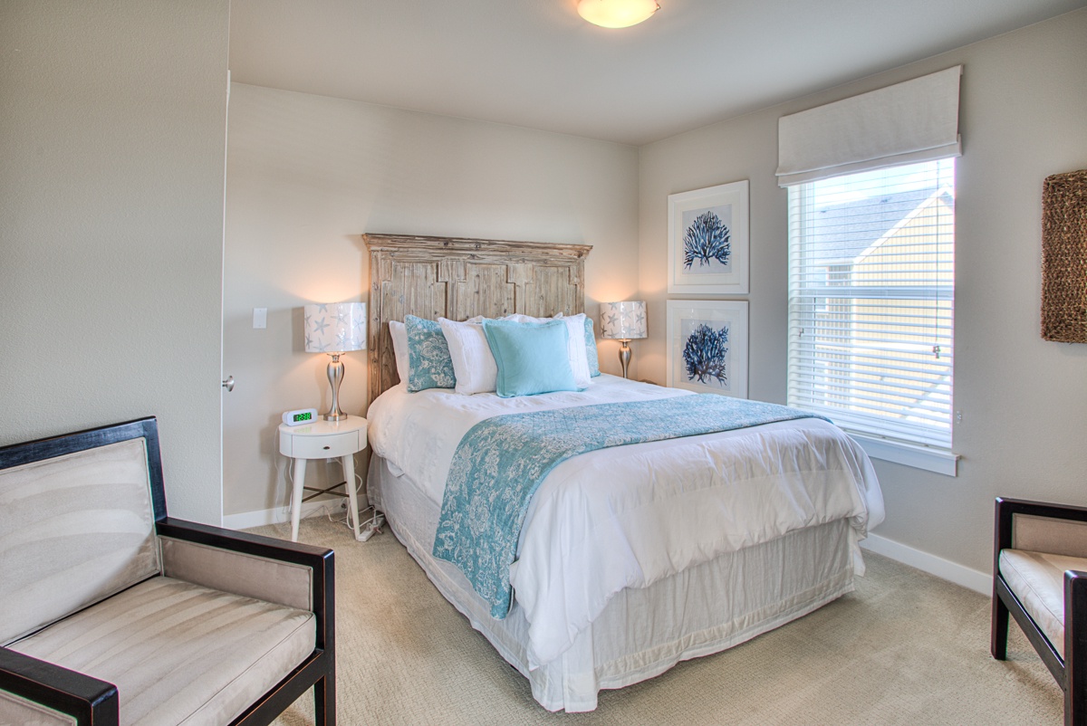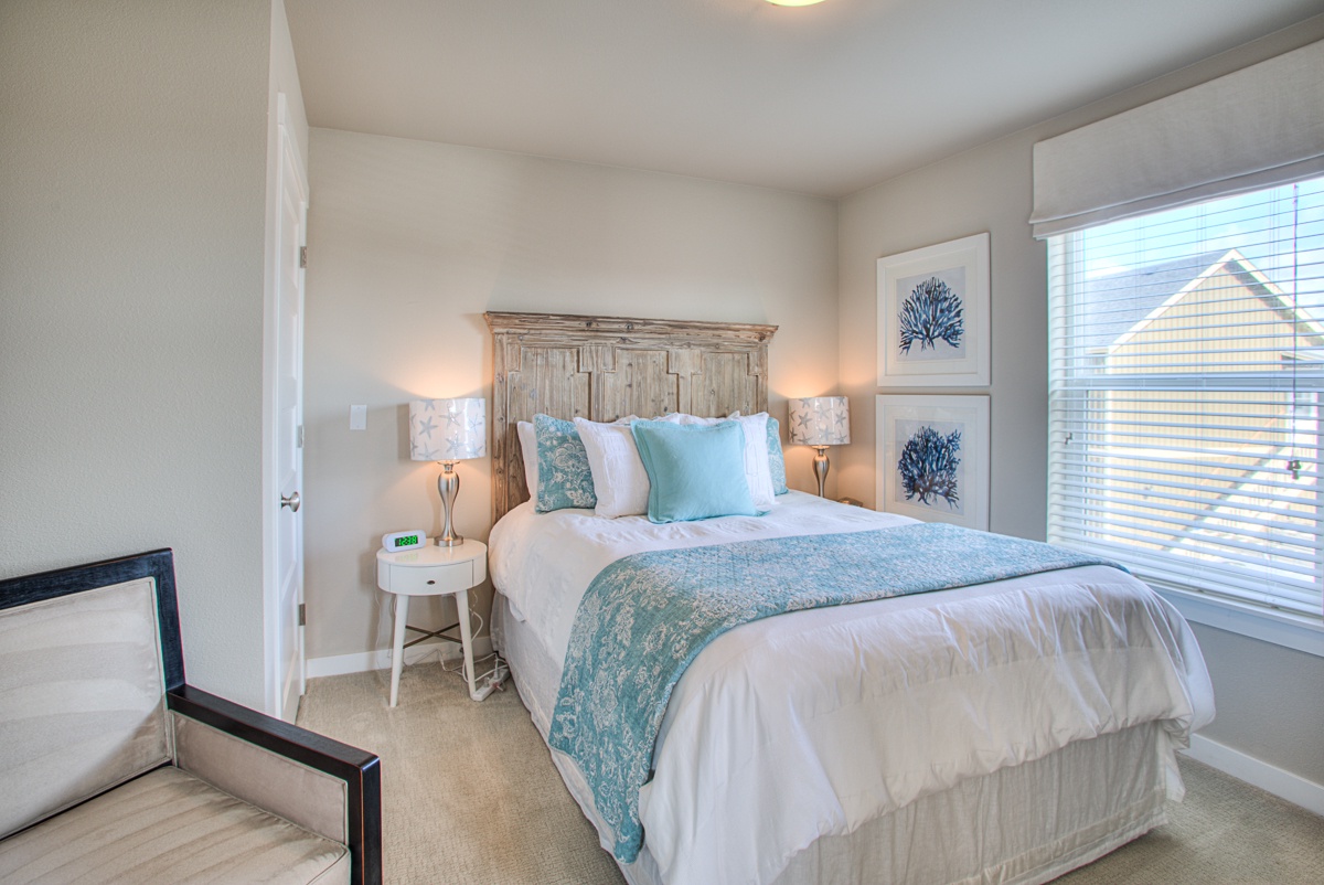 Beds: queen beds in the main level bedroom and one upstairs bedroom, and a bunk bed with a trundle in the third bedroom upstairs. Each bedroom has its own full bathroom. We also provide additional sleeping arrangements for friends and little ones – two folding sleeping pads and a pack n play.